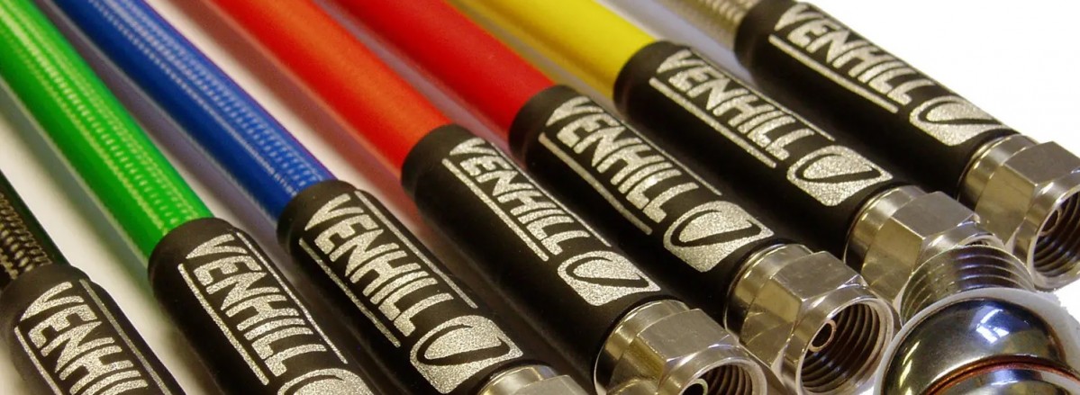 VENHILL, azienda inglese specializzata con oltre trentacinque anni di esperienza. Ogni tubo freno e frizione è testato in fabbrica singolarmente, e sono dotati di omologazione TUV. L’esclusivo processo di produzione prevede il rivestimento di un tubo di Teflon Dupont® con treccia d’acciaio inox, successivamente accessoriato con le necessarie protezioni rigide e/o flessibili e di raccordi girevoli, per assicurare un montaggio perfetto. I tubi frizione sono inoltre forniti completi di ranelle e raccordi. Si tratta quindi di un ottimo prodotto che assicura lunga durata, montaggio perfetto e grande efficienza.
