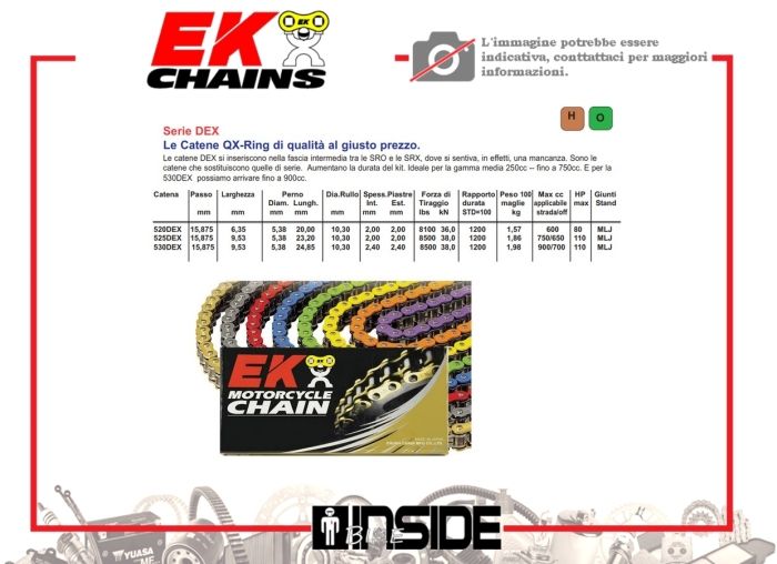 La giapponese EK realizza da anni catene alternative a quelle di primo equipaggiamento, ed è stata anche la prima ditta produttrice a realizzare catene con maglie colorate. EK garantisce per i suoi prodotti una qualità superiore e prezzi concorrenziali secondi a nessuno.