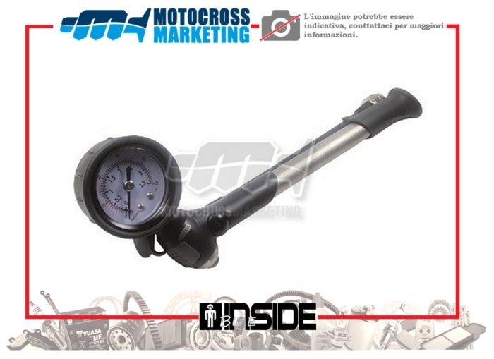 . Specifiche: Specifica per le moderne forcelle ad aria. Corpo in alluminio, manometro di grande precisione, bottone molto sensibile per scaricare la pressione in eccesso, pressione massima 3,5 Bar.Dotata di idoneo sistema, atto a non perdere aria quando si scollega